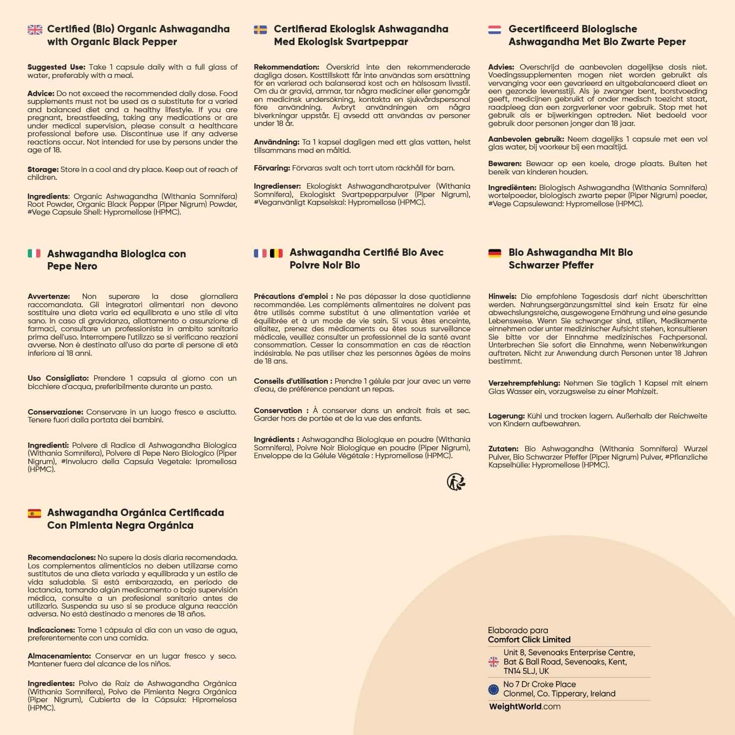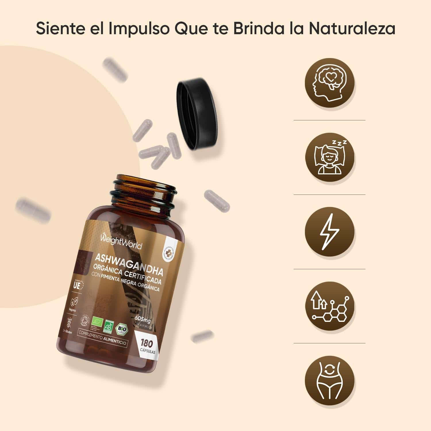 Ashwagandha y Pimienta Negra, Con Certificación Orgánica – Cada cápsula de este suplemento contiene ashwagandha orgánica en una concentración de 600mg, acompañada de pimienta negra orgánica en una proporción de 5mg. Para su uso, se recomienda tomar una cápsula al día. ¡Así de fácil! Además, este suplemento cuenta con la certificación orgánica de la Soil Association.
