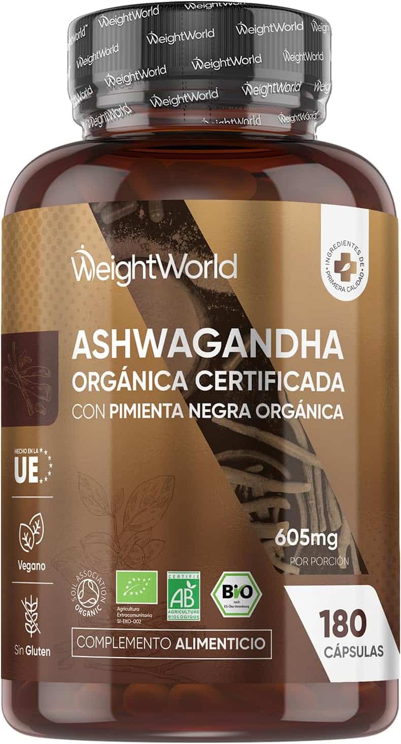 Ashwagandha Orgánica 605mg, 180 Cápsulas para 6 Meses, Con Pimienta Negra – Polvo de Raíz de Withania Somnifera, Con Certificación Orgánica, Suplemento Vegano, Sin Gluten ni OGM